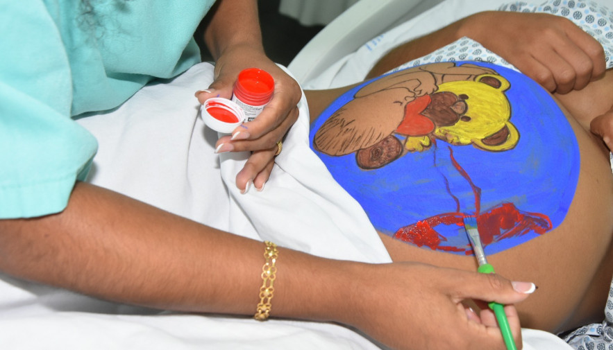 A residente de enfermagem e obstetrícia, Ingrid Paloma Rodrigues, afirmou que “a pintura do ventre materno é uma arte terapêutica, onde desenvolvemos técnicas de pintura no abdômen, que potencializa ali o vínculo da mulher com o bebê, assim como o vínculo dela com a equipe. Muitas vezes as mães chegam com ansiedade e elas ficam em um setor que vai induzir o trabalho de parto, o protocolo demora um pouco. Então nós vamos lá para desenvolver essas práticas que potencializam o desestre-se, o relaxamento. Fazemos também o escalda-pés, utilizamos óleos que contribuem para  que ela tenha alívio e uma indução de parto não farmacológico. A  aromaterapia é agradável, tanto para os profissionais quanto para a mulher”.